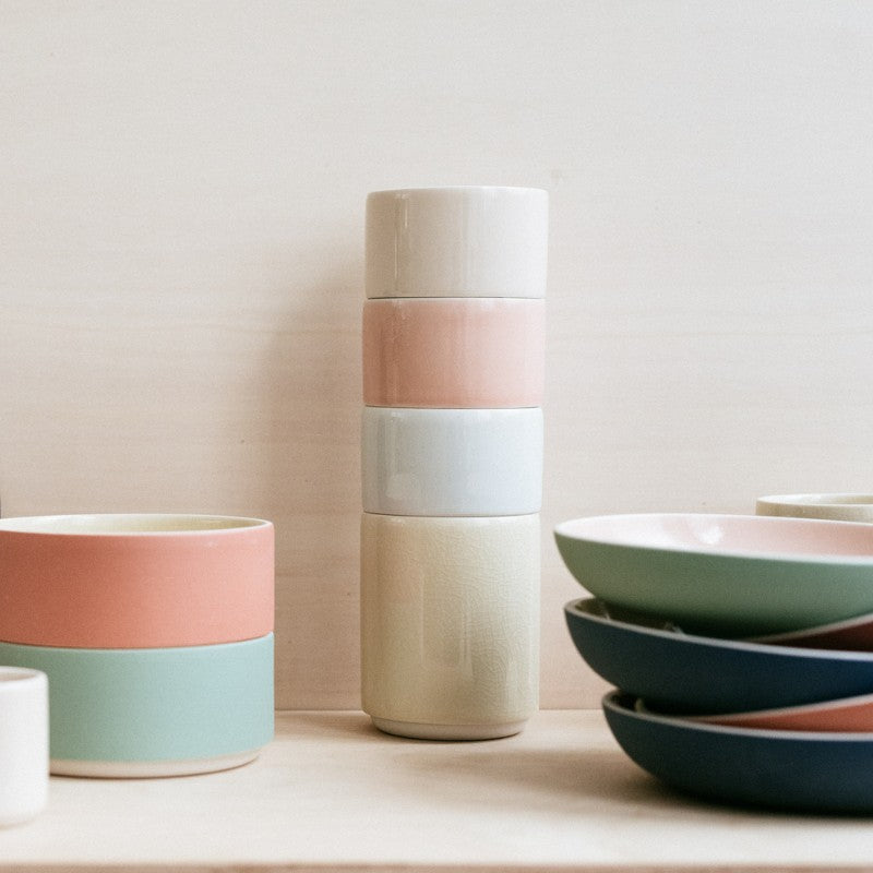 Collection urbaine, joyeusement dans son époque. Fraîche et spontanée, à l'humeur créative. Quand la couleur s'attable, joueuse. Impertinente liberté pour réveiller nos basiques. Des duos de couleurs : dialogue des contrastes et des matières. Formes easy life, empilables, multi-fonctions. Lignes à la sobriété assumée, sans fioritures. Gaieté des couleurs. Contraste innovant d'un extérieur mat coloré d'assiette et de plat. Une indispensable modernité, au quotidien. Pulvérisé à la main.