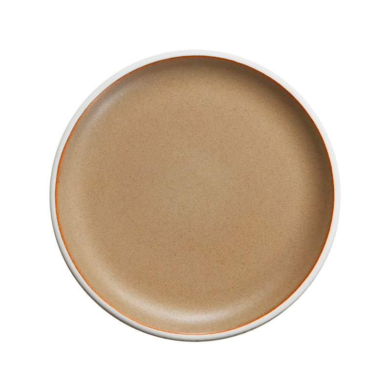 Assiette plate en céramique, forme empilable rehaussée par un bord blanc brut.